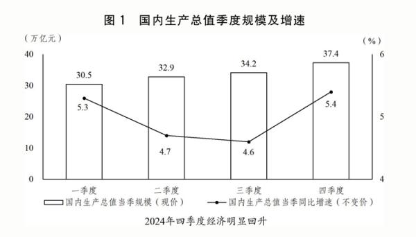 (一)因時因勢加強和創新宏觀調控,推動經濟回昇向好。紮實開展宏觀政策逆周期調節,加大政策力度,釋放政策效能,特別是9月26日中央政治局會議果斷部署一攬子增量政策,市場預期、社會信心有效提振,四季度經濟明顯回昇。全年國內生產總值(GDP)134.9萬億元、增長5%,其中,一、二、三產業分別增長3.5%、5.3%、5%。