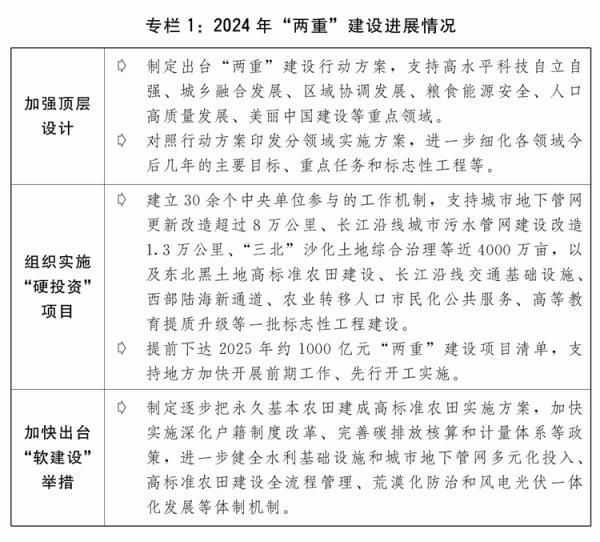 二是發行超長期特別國債支持“兩重”建設取得積極進展。著眼於系統解決強國建設、民族復興進程中一些重大項目建設的資金問題,從2024年起發行超長期特別國債支持國家重大戰略和重點領域安全能力建設。堅持自上而下、軟硬結合,建立實施項目儲備、集中聯審、專款專用、強化監督等全鏈條推進保障機制。“硬投資”方面,嚴格做好項目篩選,2024年安排7000億元超長期特別國債支持1465個重大項目建設,項目基本全部開工、全年完成投資超過1.2萬億元。“軟建設”方面,堅持項目建設和配套改革相結合,紮實推進規劃編制、政策制定和體制機制改革創新,不斷完善投入機制、提高投入效率。規范項目全過程管理方面,出臺“兩重”建設有關管理辦法,督促項目加快開工建設,嚴格資金監管,加強監測調度和現場監督檢查,確保建成優質工程、精品工程、放心工程。