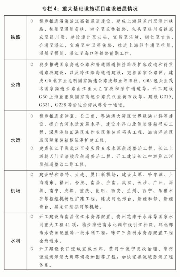 五是加快完善現代化基礎設施體系。高質量推進川藏鐵路等重大項目建設,加快構建國家水網工程體系,高水平共建西部陸海新通道。深入實施降低全社會物流成本專項行動。持續推進國家物流樞紐、國家骨乾冷鏈物流基地、國家綜合貨運樞紐體系、大宗商品資源配置樞紐等布局建設。加快完善應急物流體系。深入推進公路水路交通基礎設施數字化轉型昇級。推動各種運輸方式規則標准統一協同,加快多式聯運“一單制、一箱制”應用。