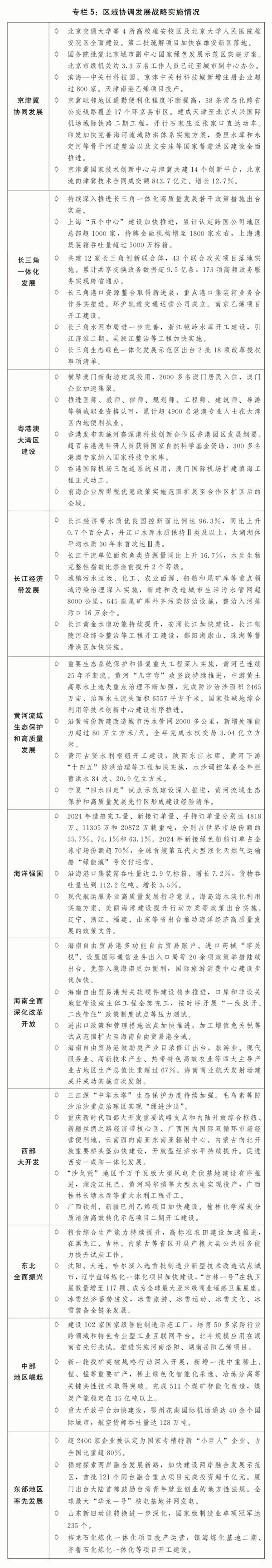 一是區域協調發展積厚成勢。京津冀協同發展走深走實,在京相關高校、醫院、中央企業總部及二三級子公司分批向雄安新區疏解,北京城市副中心行政辦公、商務服務、文化旅游等功能不斷完善,進一步支持天津濱海新區高質量發展若乾政策措施出臺實施,三省市互聯互通交通網絡更加完善、產業鏈上下游協作持續強化、公共服務共建共享水平進一步提昇。長三角一體化高質量發展深入推進,生態綠色一體化發展示范區改革授權壓茬推進,港口資源整合、軌道互聯互通等取得新進展,上海“五個中心”建設進一步加快。粵港澳大灣區建設邁上新臺階,橫琴粵澳深度合作區封關“一線”“二線”分線管理運行順利,超1.6萬名澳門居民在合作區居住生活,支持河套深港科技創新合作區深圳園區、香港園區聯動發展,創新要素跨境流動更加便捷。長江經濟帶共抓大保護、不搞大開發成效顯著,進一步抓實抓好長江大保護工作三年行動計劃出臺實施,長江十年禁漁取得明顯成效,長江乾流連續5年保持II類水質,綜合立體交通走廊加快構建,沿江高鐵全線開工建設。黃河流域生態保護和高質量發展邁出堅實步伐,農業面源、城鎮生活、工業和尾礦庫污染治理深入推進,8萬餘個入河排污口開展溯源整治,一批生態保護修復重點項目加快建設,黃河乾流連續3年保持II類水質。海洋強國建設深入推進,海洋強省、現代海洋城市、全國海洋經濟發展示范區創新發展,海洋生態環境質量持續改善,海洋生產總值超10萬億元。