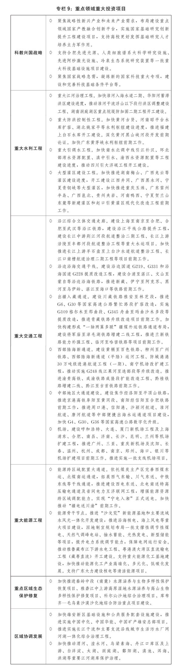 聚焦大保護、大開放、高質量發展進一步推動西部大開發形成新格局,深入實施青藏高原生態屏障區等重要生態系統保護和修復重大工程,提昇重慶、成都、西安等輻射帶動作用,加強互聯互通,做強做大特色優勢產業。支持東北地區進一步提昇維護國家“五大安全”能力,統籌推進傳統產業轉型昇級和戰略性新興產業培育壯大,加快建設交通、能源、信息等現代化基礎設施體系,深化與東北亞區域合作。落實落細新時代推動中部地區加快崛起的若乾政策措施,紮實推進“三基地一樞紐”建設,依托重要功能平臺有序擴大內陸開放。鼓勵東部地區加快推進現代化,推動福建全方位高質量發展、建設兩岸融合發展示范區,以更大力度支持山東新舊動能轉換、提昇濟南新舊動能轉換起步區產業能級。