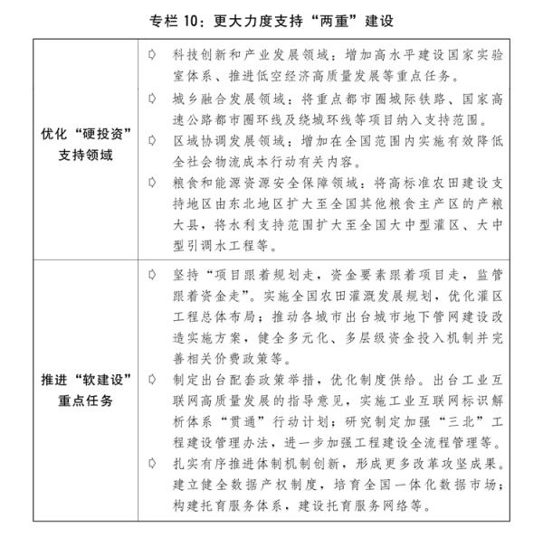 三是加力推進“兩重”建設。進一步完善自上而下的工作機制,加強“兩重”建設項目儲備,更好統籌“硬投資”與“軟建設”。安排超長期特別國債8000億元支持“兩重”建設,進一步優化具體投向並提高項目支持比例,重點支持基礎研究能力提昇、未來產業發展、東北等重點地區高標准農田建設、大中型灌區新建改造及大中型引調水和大中型水庫建設、長江經濟帶生態環境保護和綠色發展、農業轉移人口市民化公共服務體系建設、高等教育提質昇級、城市地下管網管廊建設改造等方面任務,強化超長期貸款等配套融資,高質量推進“硬投資”項目謀劃實施。加大力度推動“軟建設”政策落地見效。