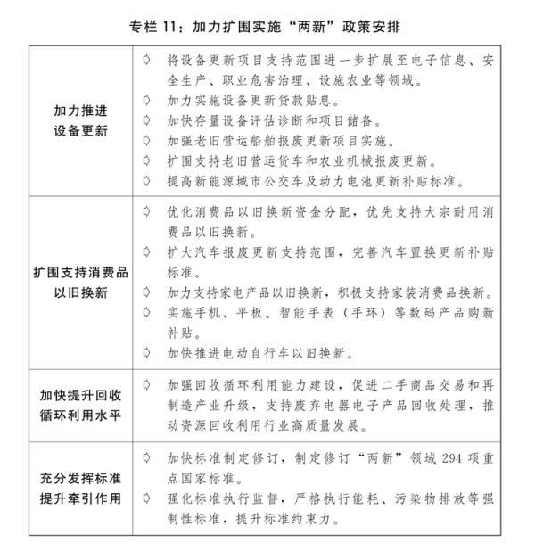 四是加力擴圍實施“兩新”政策。安排超長期特別國債5000億元支持大規模設備更新和消費品以舊換新,統籌投資、財政、金融等綜合性政策,深入推進設備更新、消費品以舊換新、回收循環利用、標准提昇四大行動。進一步加大重點領域設備更新項目支持力度,加力實施設備更新貸款貼息,加快存量設備評估診斷和項目儲備。進一步支持消費品以舊換新,擴大汽車報廢更新支持范圍,完善汽車置換更新補貼標准,實施手機、平板等數碼產品購新補貼,積極支持家裝消費品換新,簡化補貼申領和支付流程,完善資金監管機制,嚴厲打擊價格欺詐和違規騙補套補行為。
