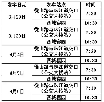 西城寢園:聯合公交公司推出掃墓專線,服務日期共計五天,往返票價15元/人。市民可以從始發站:微山路與珠江道交口(公交大樓站)乘車,直達天津市西城寢園,掃墓專線時刻表如下: