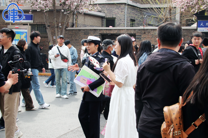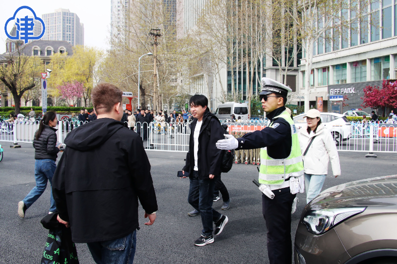 4月4日是清明節假期第一天,前來五大道地區賞花的游客較“海棠花節”開幕的第一天大幅增加。為確保市民、游客出行安全暢通,交警和平支隊貴州路大隊交警6時30分就來到河北路與成都道交口,開始對過往車輛進行疏導、提示,此時的河北路與成都道交口已經被隔離設施和可移動護欄劃分為機動車道和非機動車、行人通道。在交警疏導下,車輛、行人各行其道、秩序井然。
