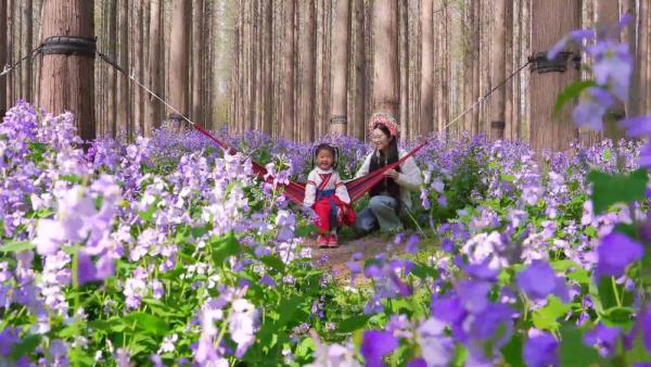 在江蘇金湖水上森林公園,水杉林間的100多畝二月蘭盛開,吸引眾多游客春游踏青,感受春日浪漫。