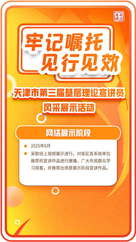 今年是『十四五』規劃收官之年,是進一步全面深化改革、奮力譜寫中國式現代化天津篇章的重要一年。為深入貫徹落實黨的二十屆三中全會精神,認真貫徹習近平文化思想,全面落實習近平總書記視察天津重要講話精神,推動黨的創新理論在津沽大地落地生根,持續擦亮『理潤津沽』宣講品牌,『牢記囑托 見行見效』天津市第三屆基層理論宣講員風采展示活動正式啟動。