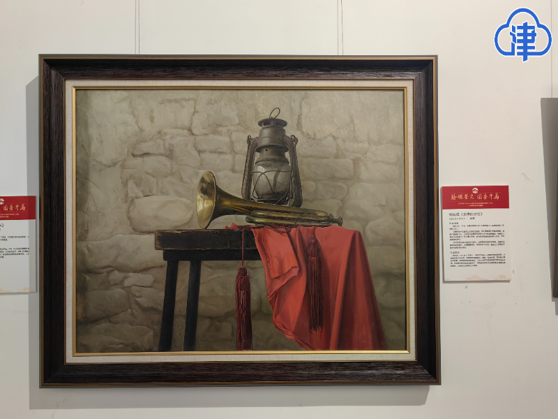 原天津畫院副院長、國家一級美術師郭鳳祥創作的《永恆的記憶》畫的是一組靜物。“把過去抗戰期間使用的馬燈、草鞋、軍號、紅旗作為主角放到作品中。表現了抗日戰爭時期人民軍隊通過馬燈指明方向;吹響軍號讓戰士們斗志昂揚,堅定了勝利的信心;在紅旗的指引下,我們打敗敵人走向勝利。”