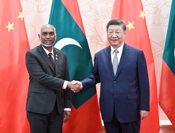 8月31日上午,國家主席習近平在天津迎賓館會見來華出席2025年上海合作組織峰會和紀念中國人民抗日戰爭暨世界反法西斯戰爭勝利80周年活動的馬爾代夫總統穆伊茲。新華社記者 岳月偉 攝