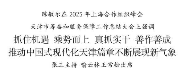 9月16日,2025年上海合作組織峰會天津市籌備和服務保障工作總結大會召開。市委書記陳敏爾出席會議並講話。他強調,要深入學習貫徹習近平總書記在峰會期間發表的一系列重要講話和視察天津重要講話精神,總結好運用好我市在籌備和服務保障工作中形成的經驗做法,承接好落實好峰會取得的重要成果,真抓實乾、善作善成,推動中國式現代化天津篇章不斷展現新氣象。