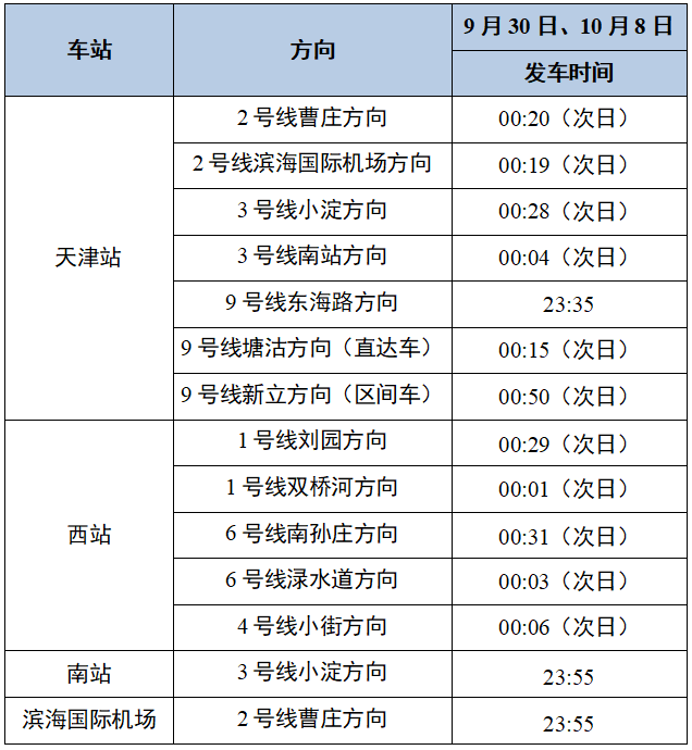 9月30日及10月8日天津地鐵“三站一場”站末班車時間表