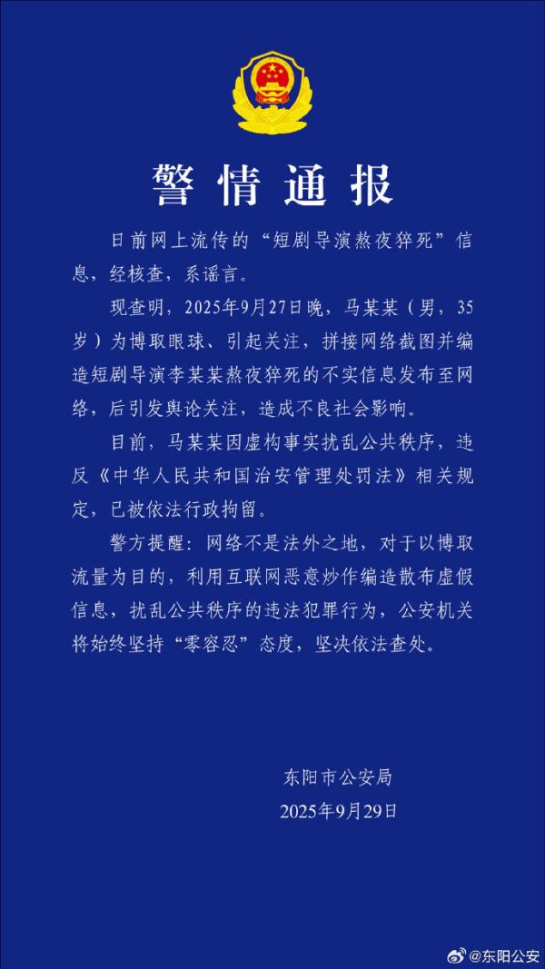 通報中稱,現查明,2025年9月27日晚,馬某某(男,35歲)為博取眼球、引起關注,拼接網絡截圖並編造短劇導演李某某熬夜猝死的不實信息發布至網絡,後引發輿論關注,造成不良社會影響。
