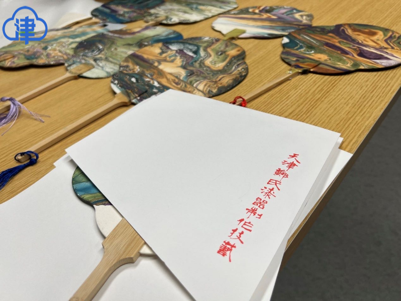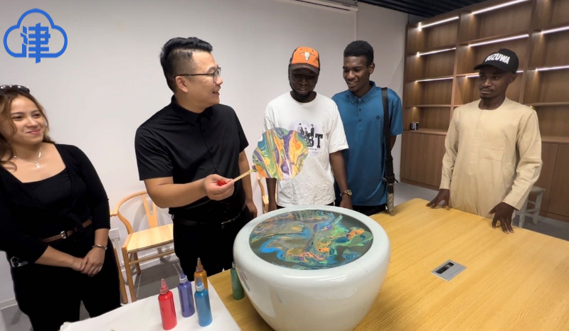 體驗一開始,天津工業大學藝術學院的鄭勇老師將大漆顏料輕輕倒入水桶,各種顏色的漆液緩緩流淌在水面上,一旁的留學生屏息凝神,看著鄭勇把紙胎扇面緩慢浸入漆液中,漆液在扇面上自然暈染,深淺交融,隨後鄭勇輕輕提起扇子,剛剛還是純白色的扇面,便出現了一幅自然、精致的水墨圖。