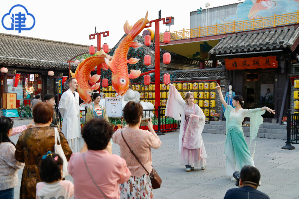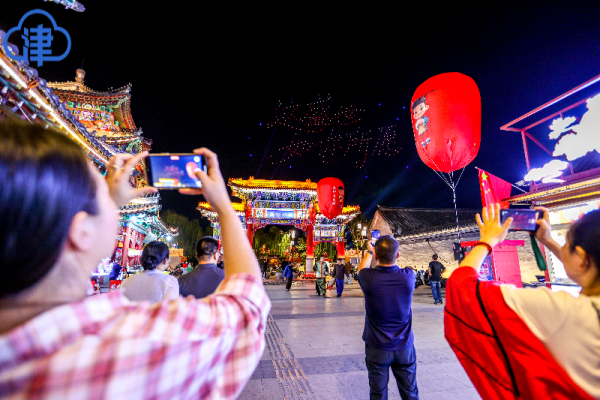 實景演藝沈浸式還原歷史。楊柳青古鎮《一河千年水·萬載楊柳情》趕大營主題實景演藝每日常態上演,通過生動劇情與細膩演繹,展現楊柳青人的家國情懷。“年畫坊月下游園會”匯聚多元演出,仕女掌燈儀式營造濃厚節日氛圍,無人機孔明燈秀點亮夜空,有效延長游客停留時間,豐富夜間文旅體驗。
