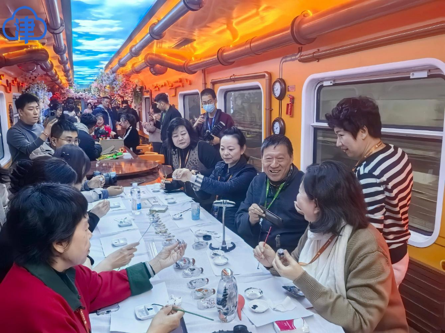 “津旅時光號”旅游專列上,乘客體驗非遺