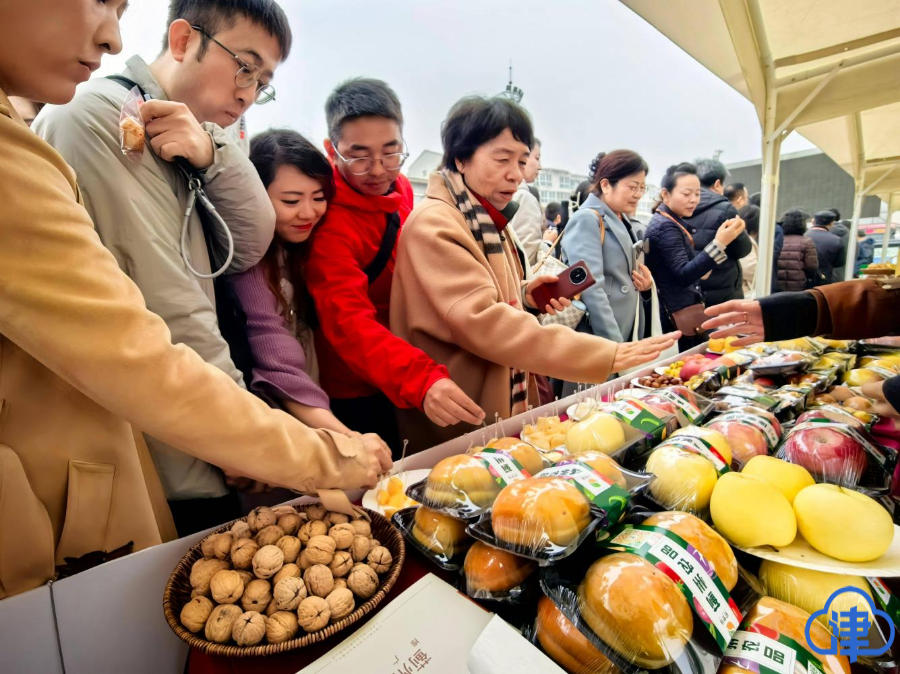 除了文化元素,薊州區還將農產品搬來了薊州北站前廣場。香甜可口、風味十足的薊州農品抓住了人們的味蕾,品嘗的、詢價的、掃碼購買的乘客絡繹不絕。