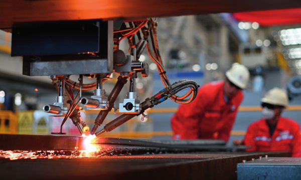 工作人員在海油工程天津智能制造基地制管作業車間調試數控切板機(2024年10月10日攝)。趙子碩攝/本刊