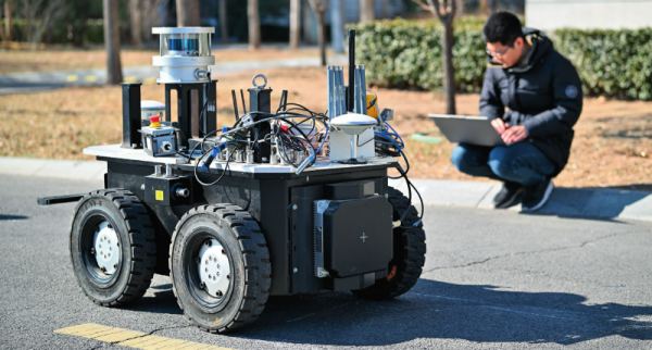 工程師在京津中關村科技城道路上對一款防爆輪式巡檢機器人進行路測調試(2025年2月20日攝)。孫凡越攝/本刊