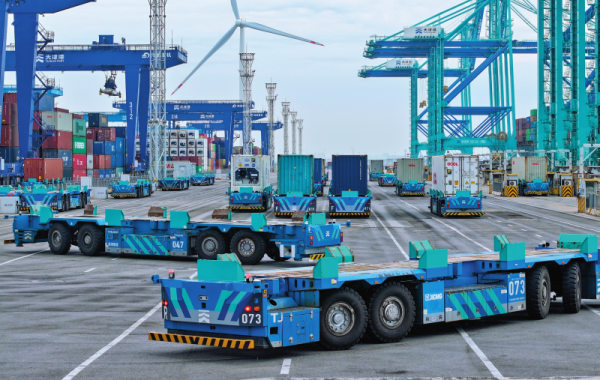 智能水平運輸機器人行駛在天津港第二集裝箱碼頭(2025年6月19日攝)。趙子碩攝/本刊