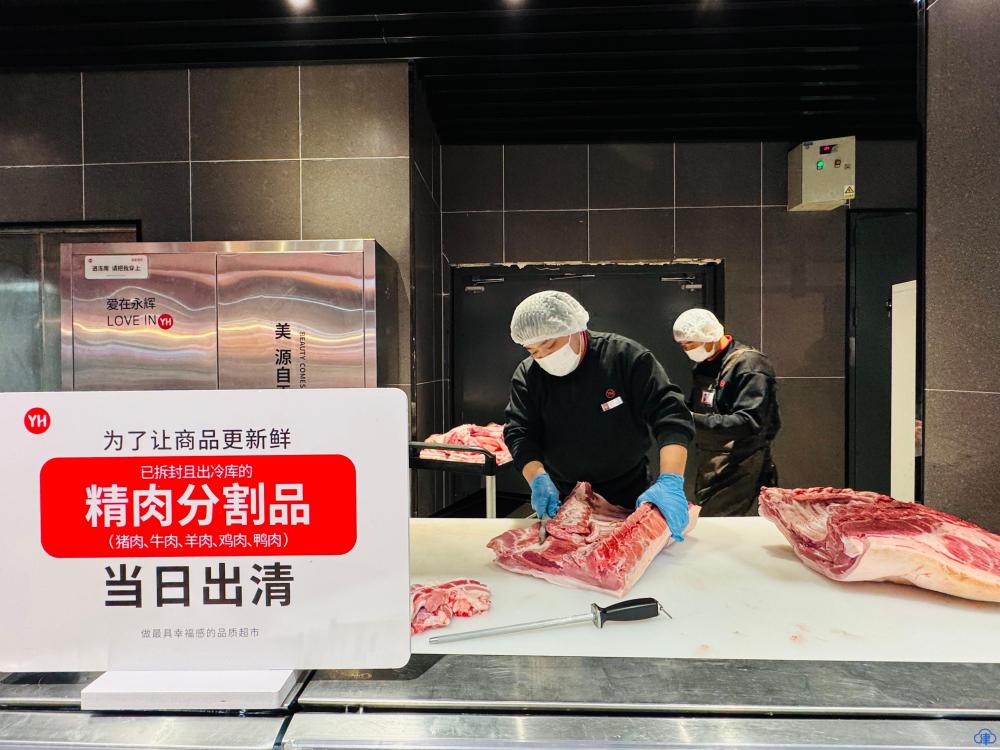 記者看到,肉禽櫃臺可根據顧客需求提供切絲、切片、絞肉、剝皮、剔骨、牛排免費代煎等服務;海鮮櫃臺提供清洗、打氧、泡沫箱打包等服務;購買整個西瓜、榴蓮、椰青、鳳梨等商品,免費提供現切、剝殼、開口服務;為顧客現剝榴蓮後提供獨立包裝口香糖。門店還配備實時農殘檢測公示屏,保證消費者的食品安全。