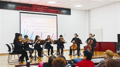隨著《四小天鵝舞曲》《藍色多瑙河圓舞曲》的旋律響起,一場南開區嘉陵道街道辦事處聯合南開區文化館、天津歌舞劇院為社區居民奉獻的文化大餐拉開帷幕。“藝潤南開·惠民同行”文化惠民基層行系列活動來到了泊江裡社區,天津歌舞劇院Vivace室內樂重奏組的藝術家們把交響名曲送到居民“家門口”,打通了文化惠民服務的“最後一公裡”。
