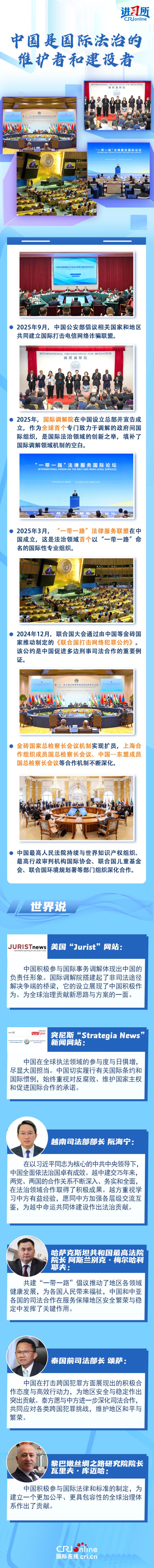 “以國際良法促進全球善治,助力構建人類命運共同體。”作為國際法治的維護者和建設者、全球治理的參與者和推動者,中國積極參與聯合國框架下的國際規則制定,主動推動國際爭端解決機制的完善,推動國際關系法治化。國際社會普遍認為,中國積極參與國際法律和標准的制定,盡顯大國擔當,為建立一個更加公平、更具包容性的全球治理體系作出了貢獻。