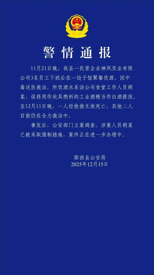 湖北省鄖西縣公安局12月15日發布警情通報:11月21日晚,我縣一民營企業神風實業有限公司3名員工下班後在一餃子館聚餐飲酒,因中毒送醫救治。所飲酒水系該公司食堂工作人員胡某,誤將用作炊具燃料的工業酒精當作白酒提供。至12月11日晚,一人經搶救無效死亡,其他二人目前仍在全力救治中。事發後,公安部門立案調查。涉案人員胡某已被采取強制措施,案件正在進一步辦理。