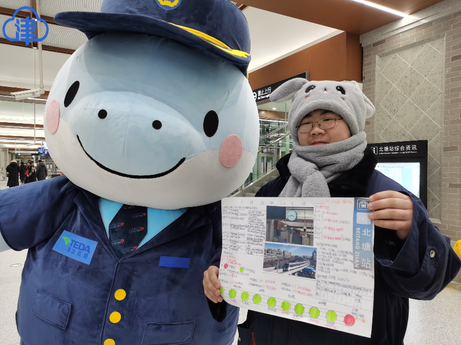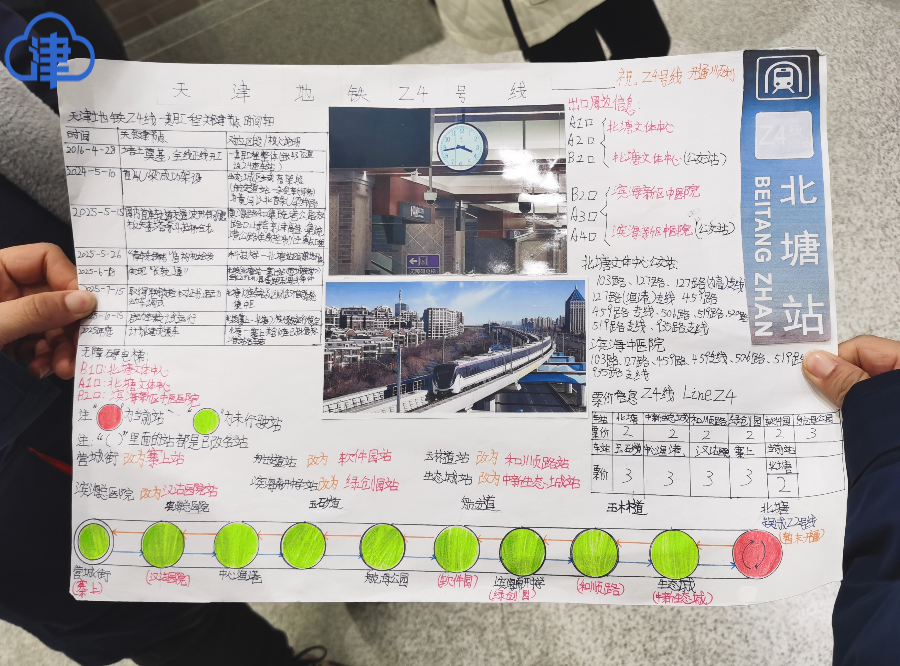 紀彥哲今天是專門從紅橋區輾轉乘車約3個小時,來到北塘站乘坐Z4線,就為了親身感受Z4線首日開通的盛況。他還特別准備了“手抄報”,從北塘站開始,送給每一站的工作人員。