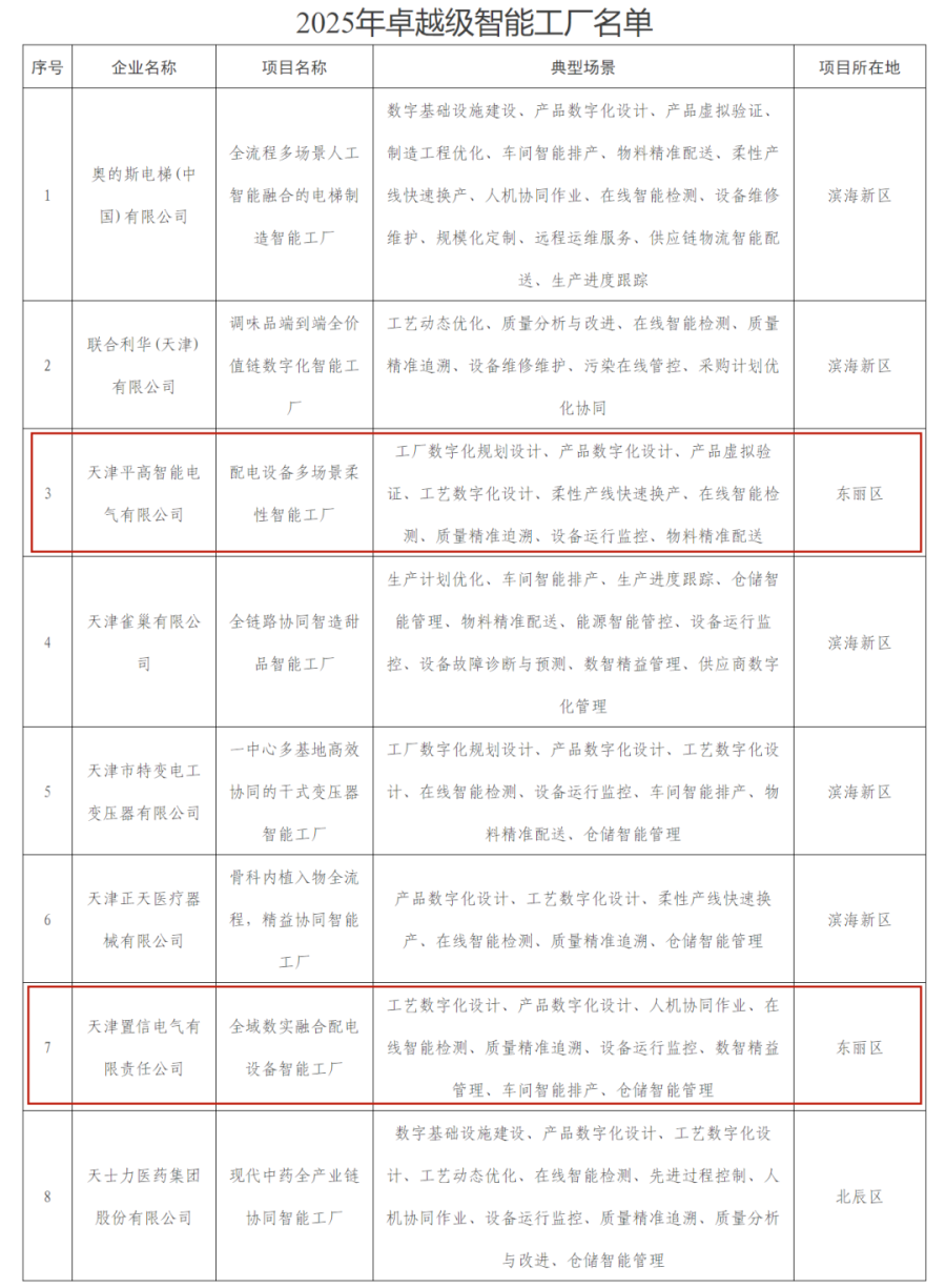 天津北方網訊:記者從東麗區獲悉,近日,工業和信息化部等6部委印發通知公布了2025年卓越級智能工廠名單,天津市奧的斯電梯等8家企業入選。其中,東麗區天津平高智能電氣有限公司的配電設備多場景柔性智能工廠項目、天津置信電氣有限責任公司的全域數實融合配電設備智能工廠項目光榮上榜。