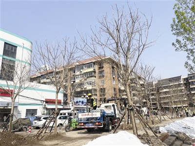昨天上午在南開區臨汾路上,臨近菜市場的一塊綠地裡,施工人員正在忙著各自手中的工作,有些人忙著給新栽的樹木澆水,同時也給施工區域灑水降塵,還有部分施工人員在鋪設磚石。臨汾路的周邊同樣分布著居民區,既有老舊居民區也有新建的商品房小區。但是,無論是西營門外大街,還是周邊的幾條道路,雖然行道樹不少,卻沒有口袋公園等供居民休閑的場所。正在施工的這片綠地,就是根據居民的訴求,要改造成口袋公園,名字就叫做臨汾公園。